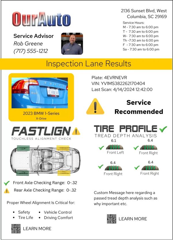 The data visualization graphics can be displayed on a monitor, PC, tablet, smartphone or printed copy and can help close service sales for tires, alignment and suspension.