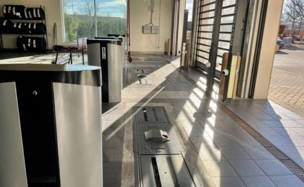 The camera mounted between the platform takes a photo of the car’s license plate as the vehicle passes by, without needing external sensors.